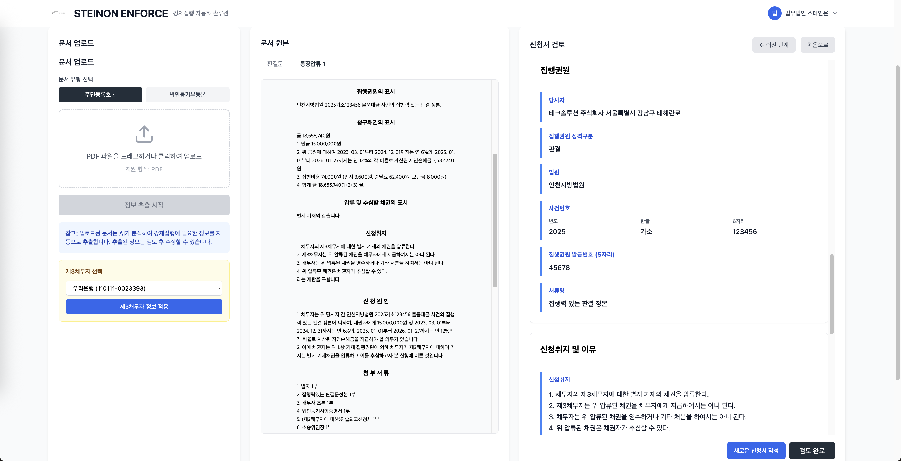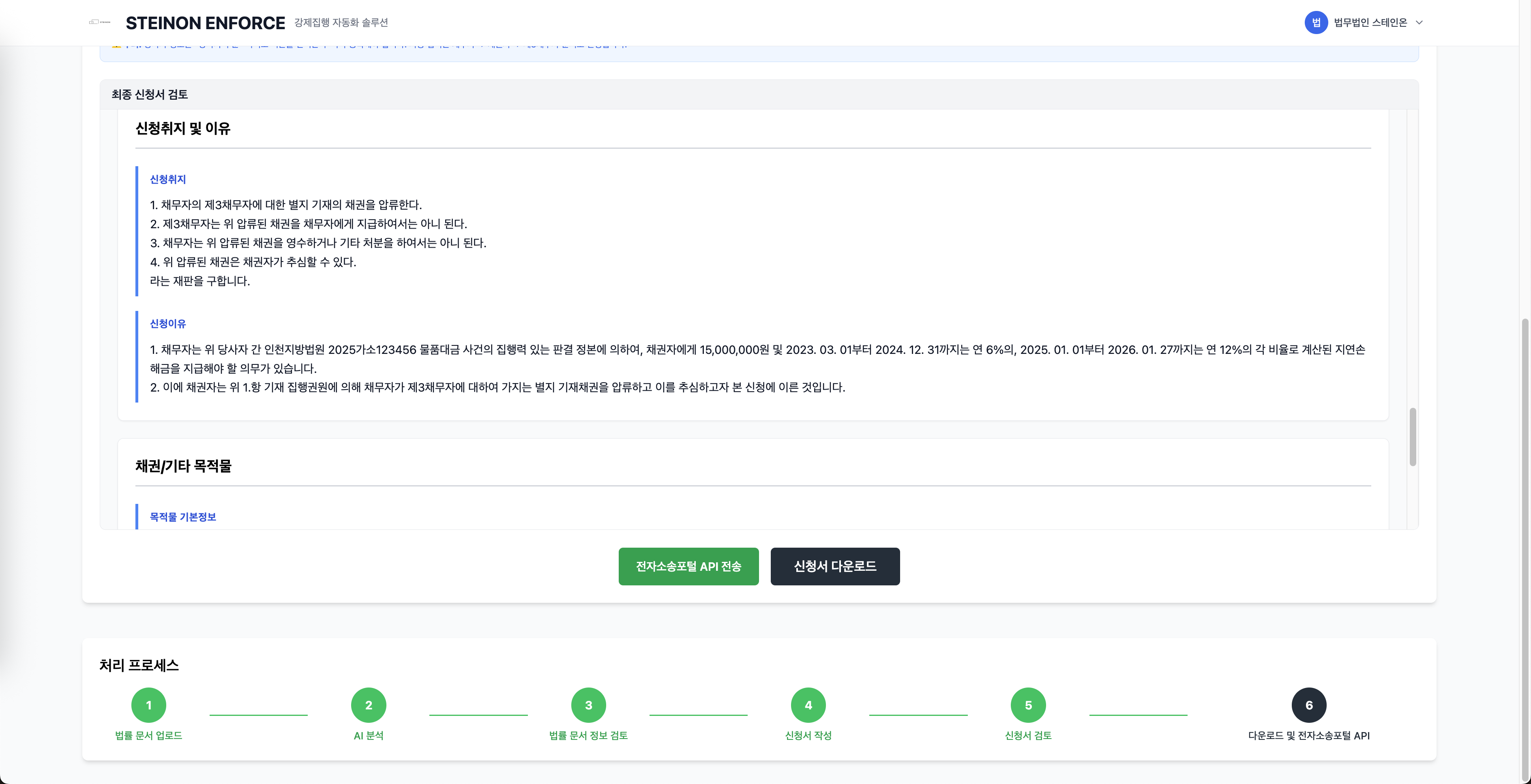 STEINON ENFORCE는 신청서 단위가 아닌 사건 단위로 강제집행 업무를 자동화하는 법무법인 전용 B2B SaaS 플랫폼입니다.